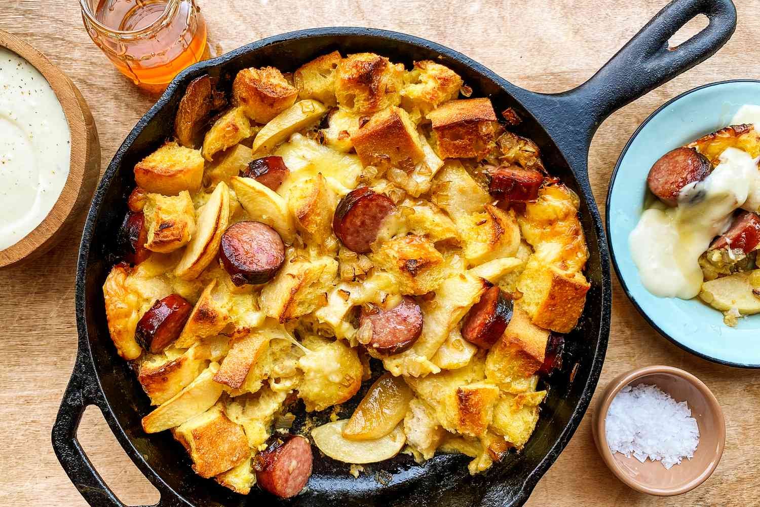 This hearty breakfast casserole from Portland, Oregon–based chef Elias Cario layers smoky kielbasa with sweet apples, caramelized onions, and plenty of cheese. Serve wedges with honey, salt, and creamy Mornay sauce.