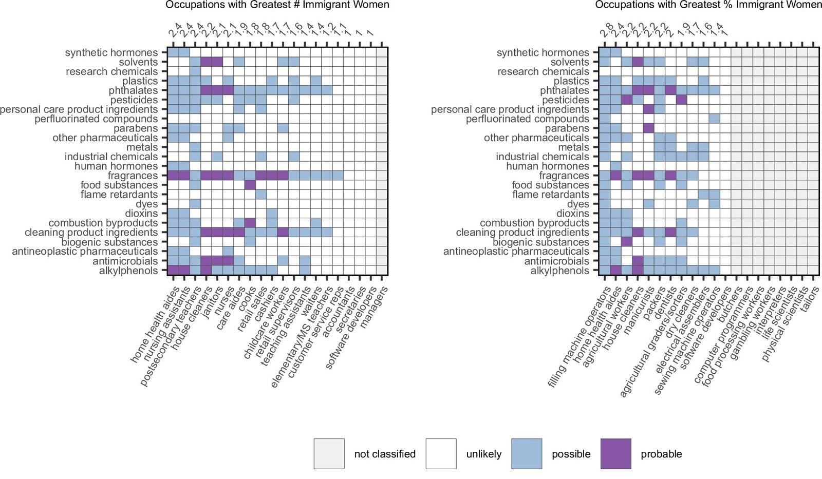It was observed that immigrant women are disproportionately represented in high-risk occupations, indicating not only a higher likelihood of exposure to hazardous substances but also an increased risk of long-term health consequences associated with their work. Disparities based on language and education levels were also noted, with women possessing higher education and stronger English language skills more likely to work in lower-exposure roles compared to those with limited education and English proficiency.
