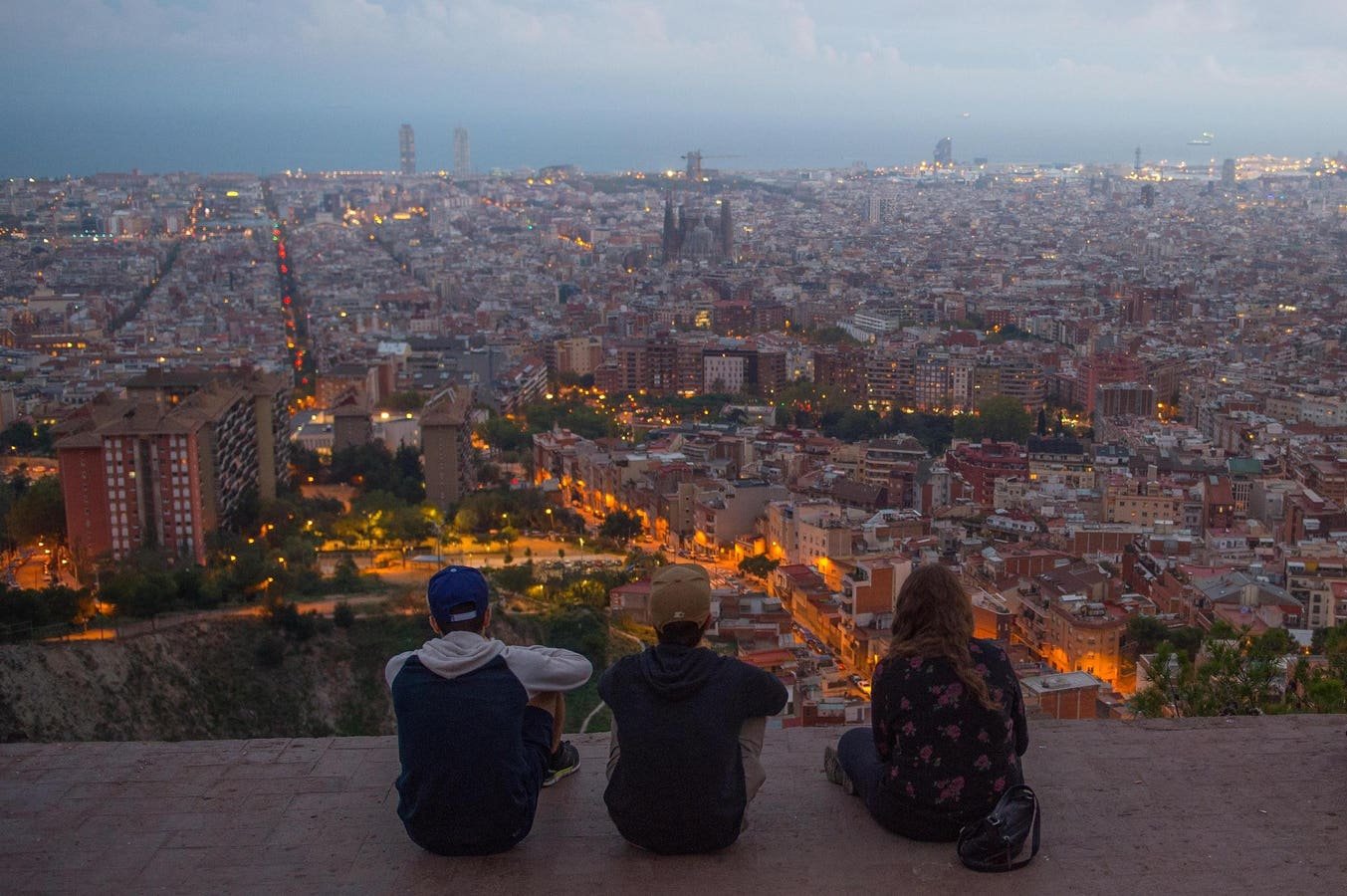 BARCELONA, SPAIN – OCTOBER 26: People enjoy the view over the city with ‘La Sagrada Familia’ in the background on October 26, 2015 in Barcelona, Spain. ‘La Sagrada Familia’ Foundation announced on October 21 that the temple has entered final construction phase. The first stone was laid on March 19, 1882 following the Neo-gothic design drawn up by the architect Francisco de Paula del Villar y Lozano, the first architect of the ‘Sagrada Familia’. Antoni Gaudi took over the design of the Sagrada Familia in 1883 until his death on June 10, 1926 due to a traffic accident. The main projects being undertaken over the coming years are the construction of the west sacristy, the central towers and the Tower of Jesus which will eventually be crowned with a cross 170 metres above the ground level. According to ‘La Sagrada Familia’ Foundation, the temple could be finished in the first third of the 21st century. More than 3 million people visit the temple each year. (Photo by David Ramos/Getty Images)