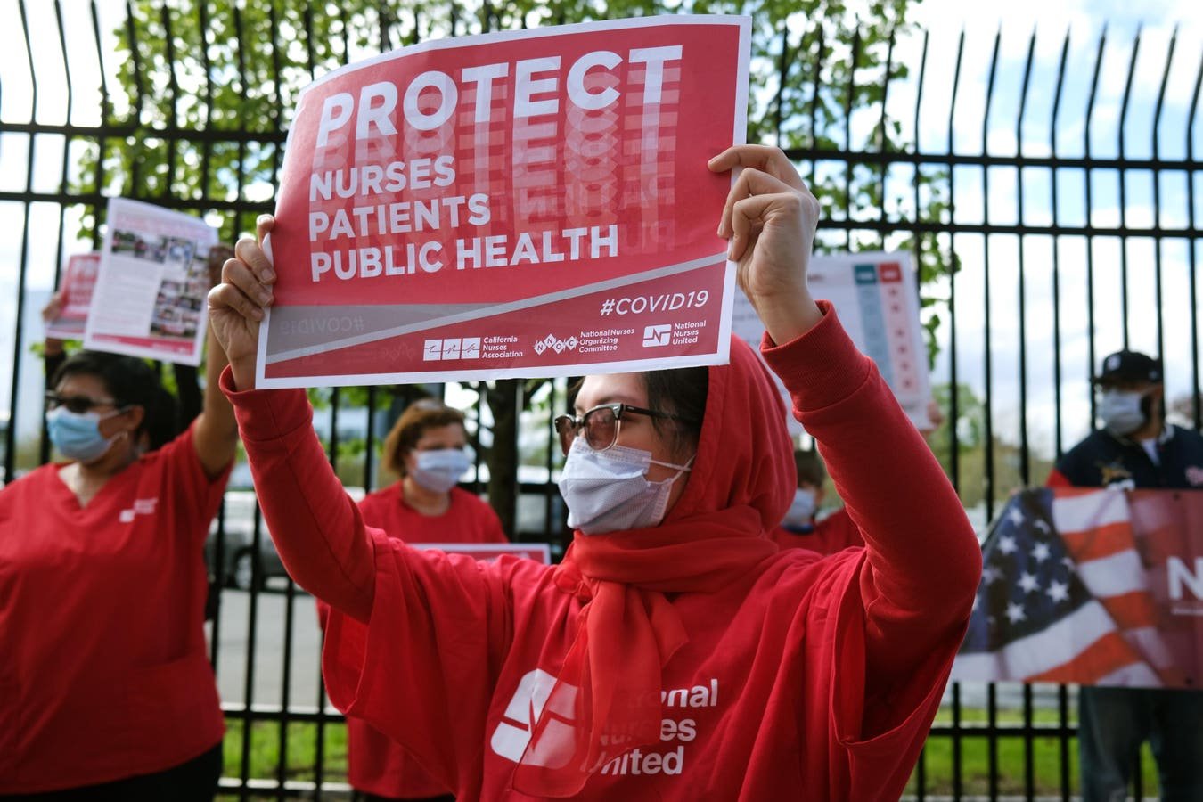 NEW YORK, NY – MAY 01: Bronx VA Medical Center nurses hold a demonstration and join other nationwide ‘May Day’ actions demanding increased COVID-19 protections for nurses and health care workers on May 01, 2020 in New York City. According to National Nurses United, 139 hospitals in 13 states and representing more than 95,540 nurses held similar demonstrations across the nation to protest protest the denial of worker compensation claims and safety leave requests for those who have both been exposed and tested positive for COVID-19. (Photo by Spencer Platt/Getty Images)